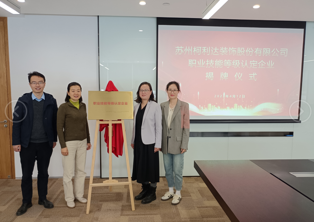 4月12日,蘇州柯利達裝飾股份有限公司在研發(fā)大樓舉行“職業(yè)技能等級認(rèn)定企業(yè)”揭牌儀式,蘇州市高新區(qū)獅山橫塘街道組織人事和社會保障局局長周麗平、柯利達人事總監(jiān)嚴(yán)琳出席揭牌儀式。
